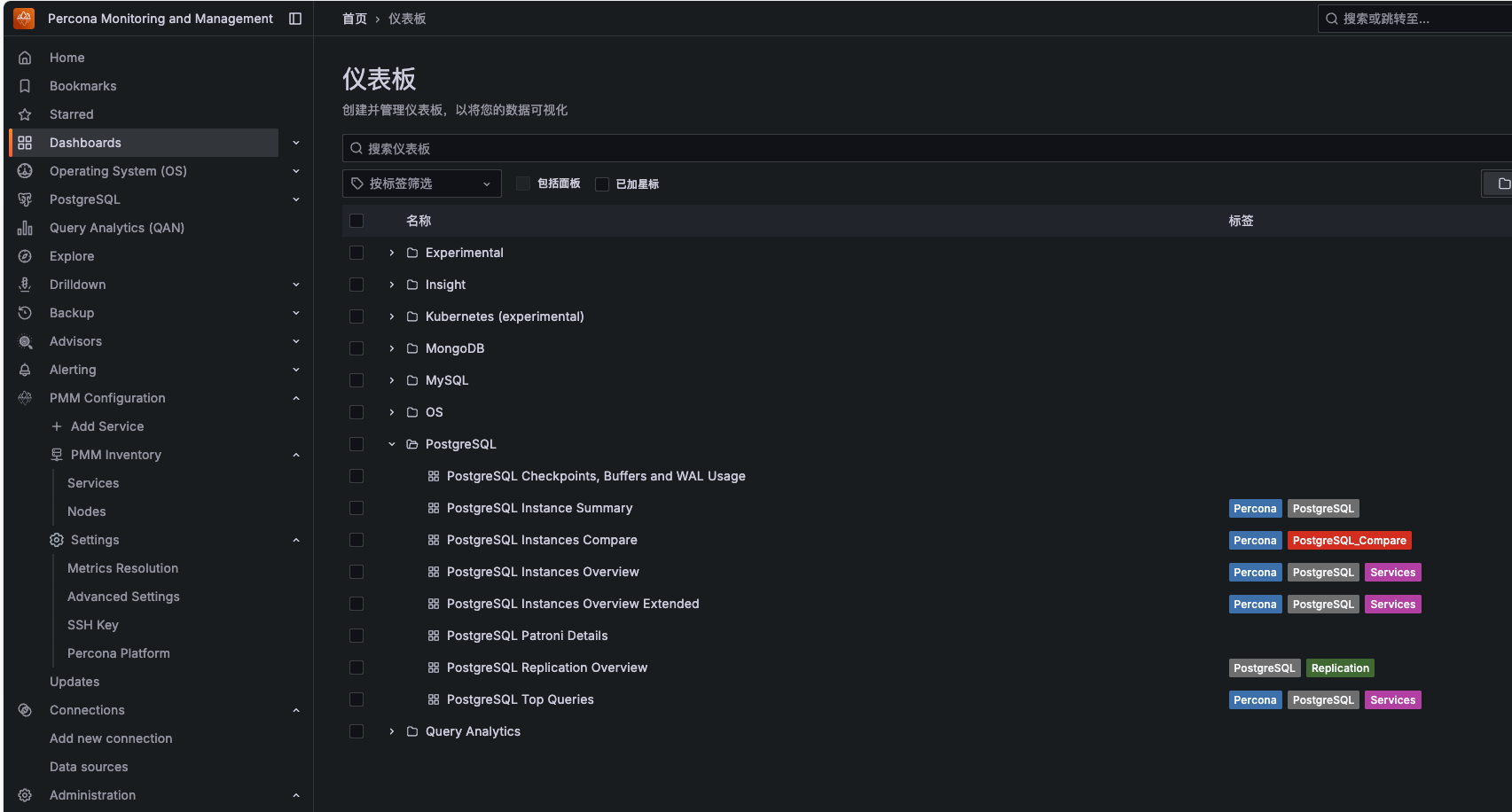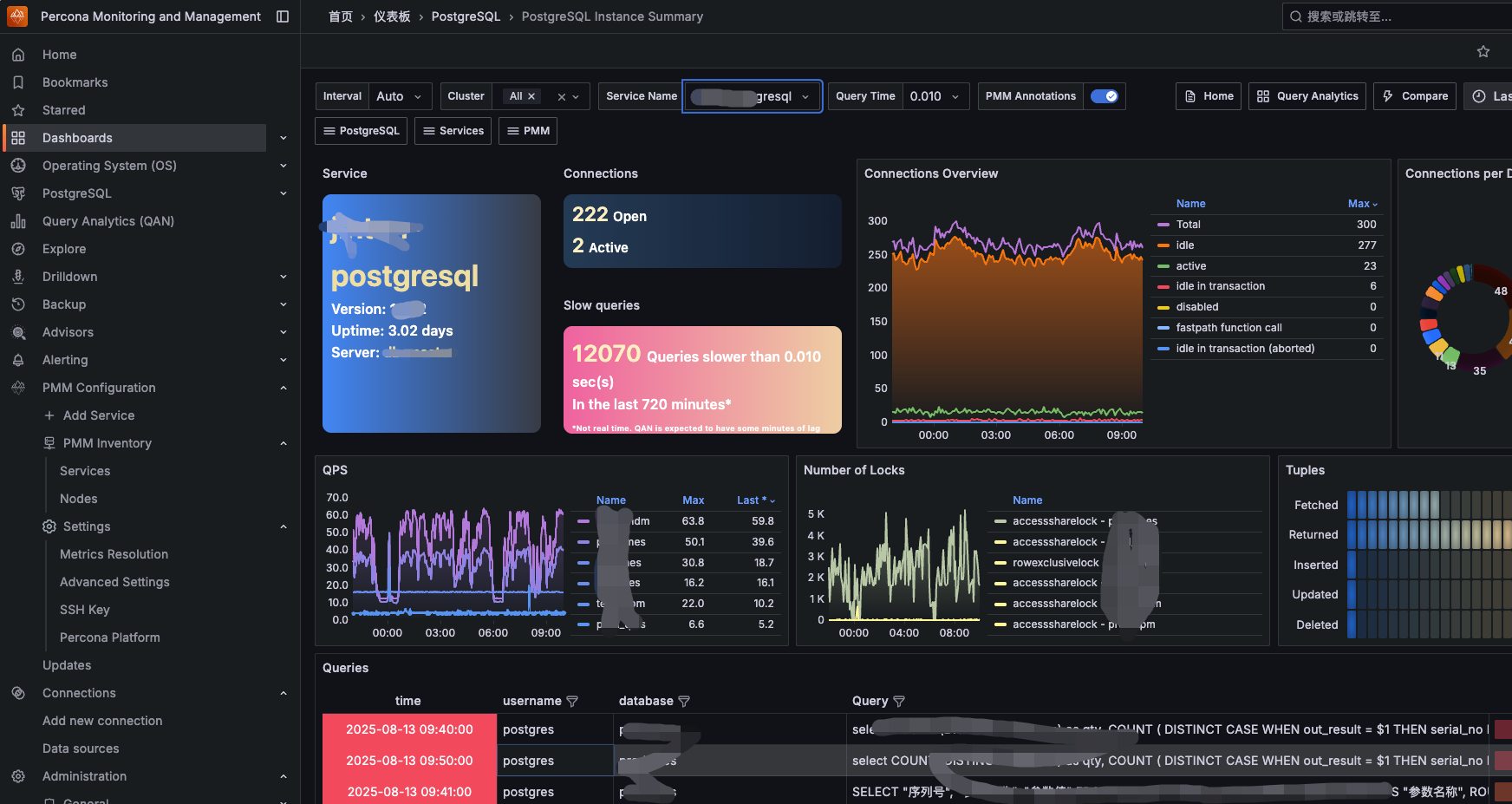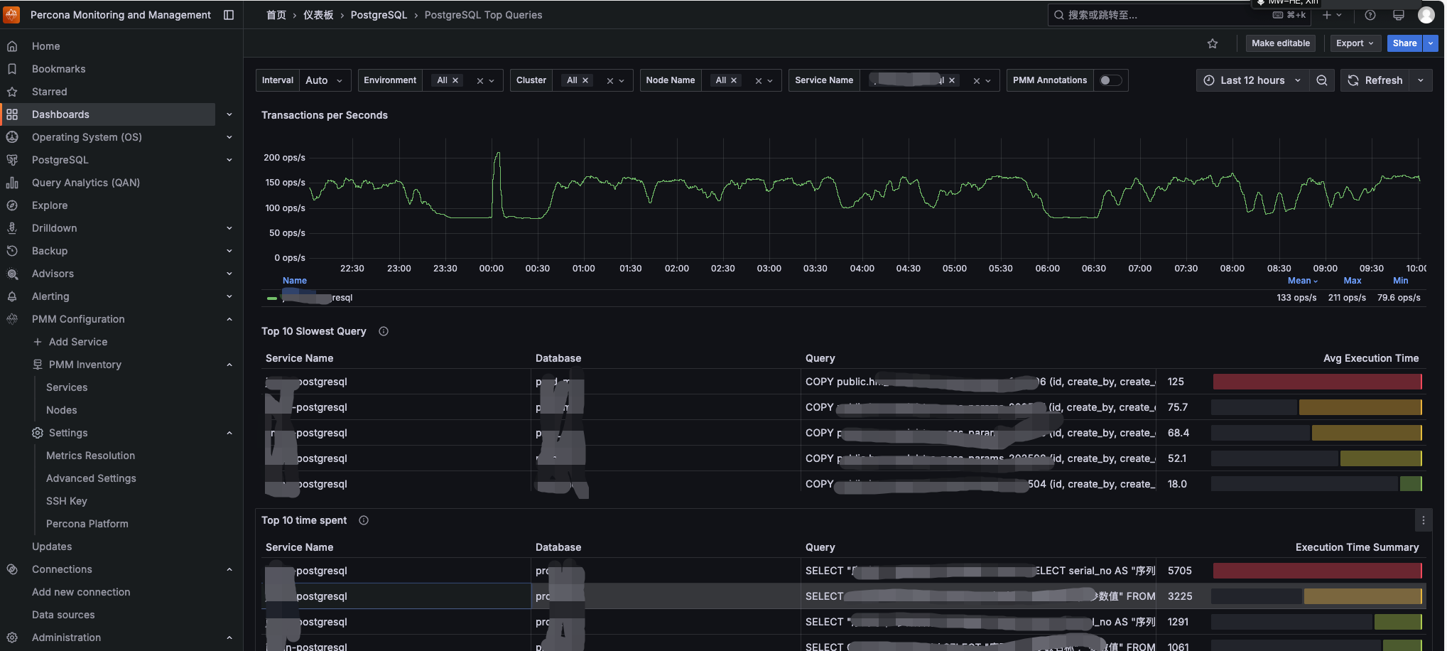 pmm-admin add postgresql \ --username=pmm \ --password=XXX \ --host=127.0.0.1 \ --port=5432 \ --query-source=pgstatements \ --disable-collectors=walreceiver \ --service-name=XXX之所以要禁用walreceiver,是在实际启动后,发现pmm-agent在查询监控时老是在查一个不存在的字段,导致数据库频繁报错,可能是agent版本兼容问题吧,故将其禁用掉。