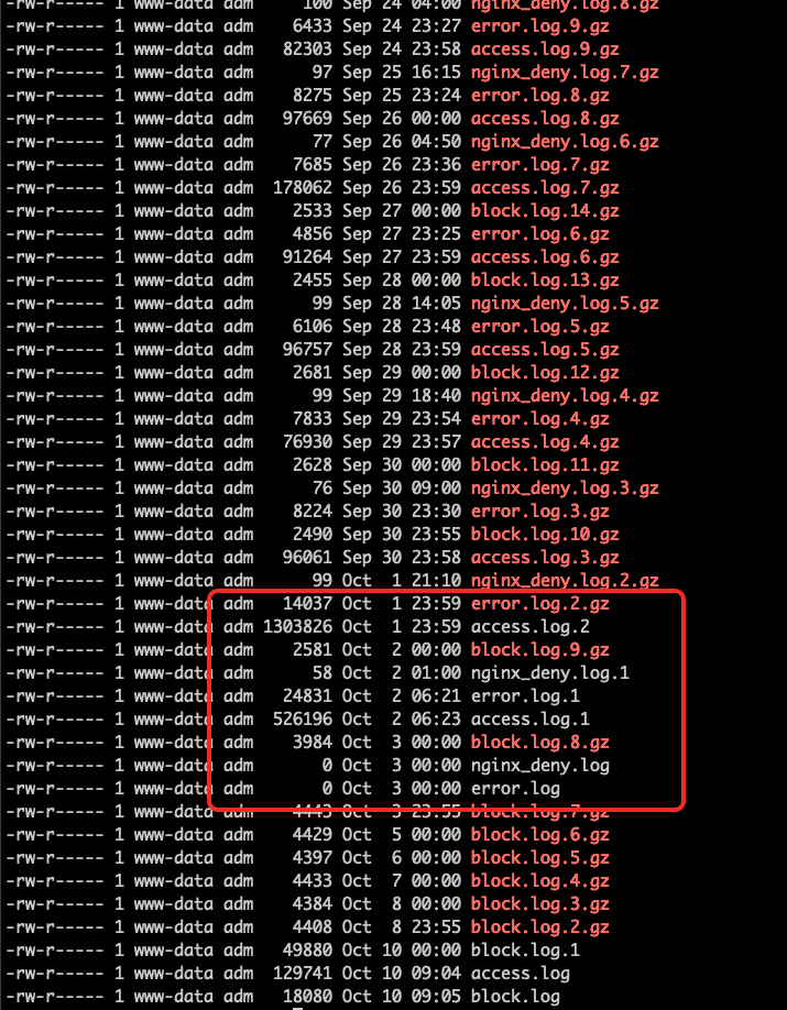 检查Nginx本身的错误日志,默认路径是/var/log/nginx,看到从10月3日起,就没有访问日志了,推测应该是10月2日就挂了。