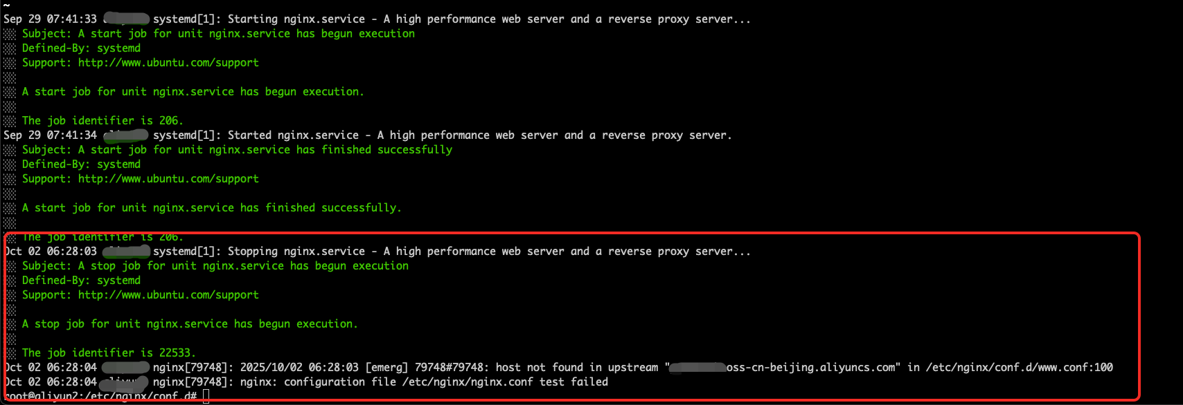 上面日志,可以看到是10月2日,6点28分,Nginx被操作系统重启,但是启动的时候,无法解析配置的upstream的域名,导致配置文件解析失败,进而引起Nginx进程启动失败。 -