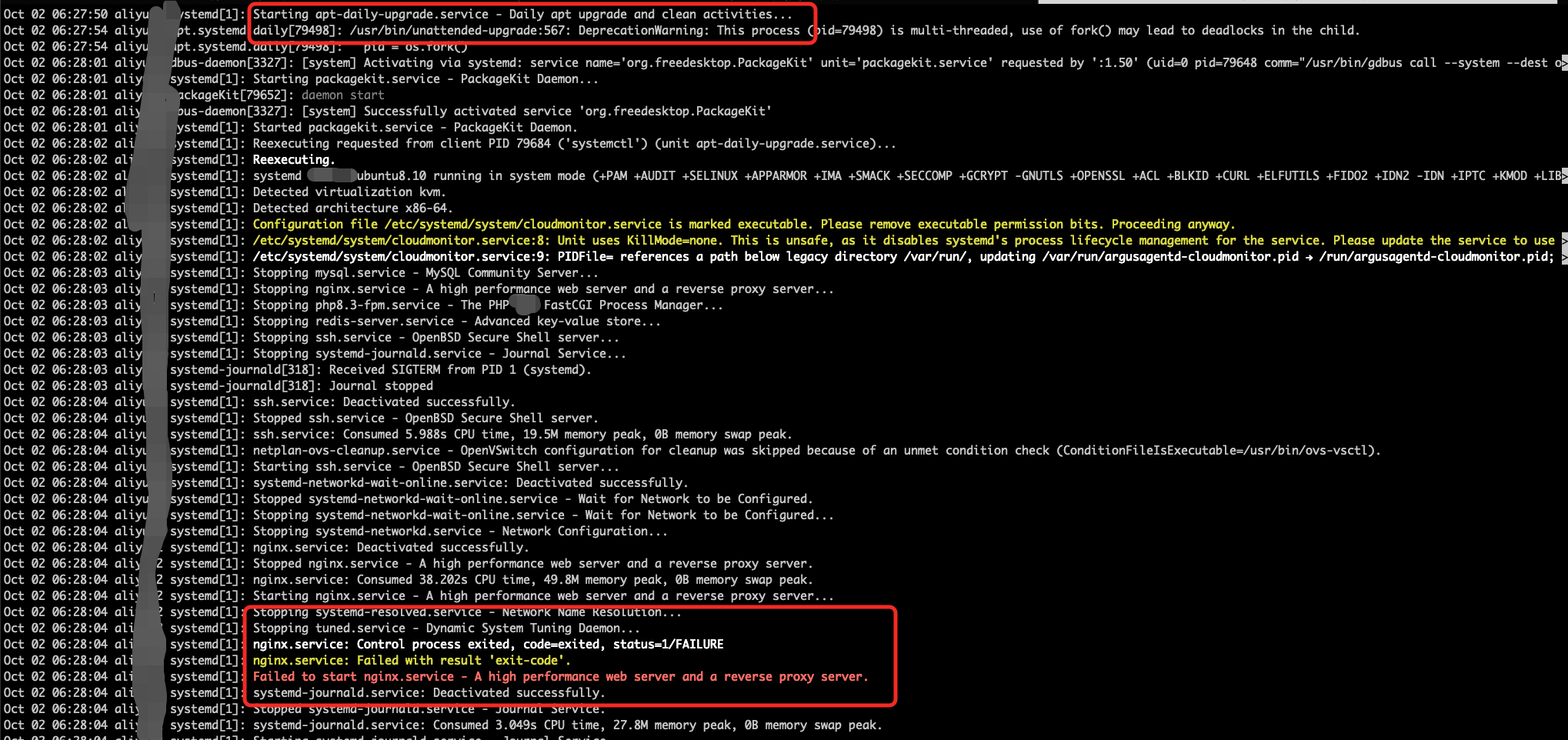 从系统日志中可以看到是Ubuntu操作系统本身的apt-daily-upgrade.service - Daily apt upgrade and clean activities...在上午6点27分启动,执行之后,重启了mysql、php、Nginx、ssh等进程,然后Nginx启动失败了;到这里,追查到了Nginx被重启的源头。 -